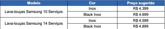 As lava-louças de 10 e 14 serviços, nas cores Inox e Black Inox, já podem ser encontradas na Loja Online da Samsung. A partir do meio de abril, as lava-louças poderão ser encontradas também nos varejistas nacionais. Confira a tabela de preços abaixo: